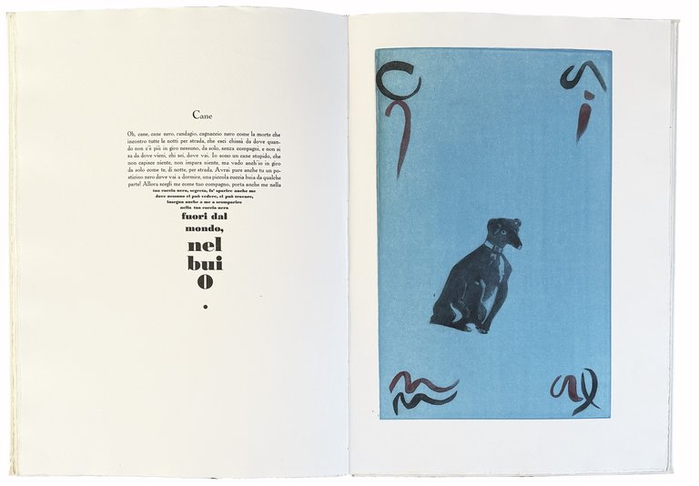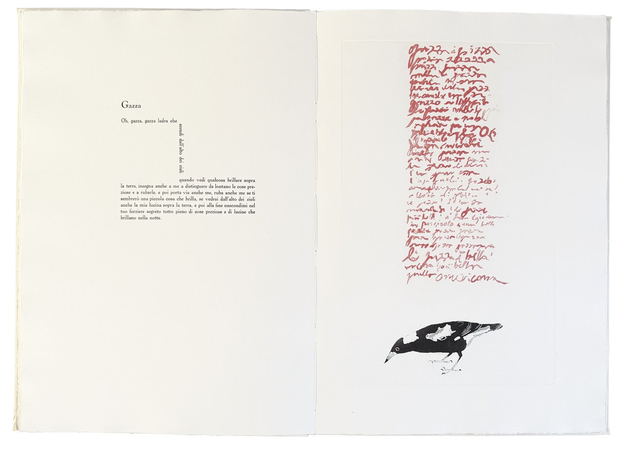 Mm. 50x25. Pp. [22]. Ultima carta bianca. Legatura originale d'artista con figura a sbalzo di una rana sul piatto anteriore. Con otto calcografie originali di Giuliano della Casa stampate nei laboratori di Arti Incisorie. Esemplare 1 (sottoscritto a matita dagli autori) di 40 stampati su carta Graphia delle cartiere Sicars di Catania con caratteri mobili Iliade corpo 18. Ottima conservazione.