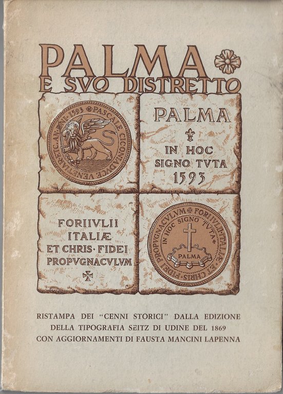 A cura del Comune di Palmanova. Ristampa dei cenni storici dalla ediizone della tipografia Seitz di Udine del 1869 con aggiornamenti di Faustaa Mancini Lapenna. 3 tavole illustrate + 1 cartina ripiegata, 143 p. Molto buono (Very Good) copertina ingiallita e con piccolo strappetto tra piatto e dorso, pagine in perfetto stato.