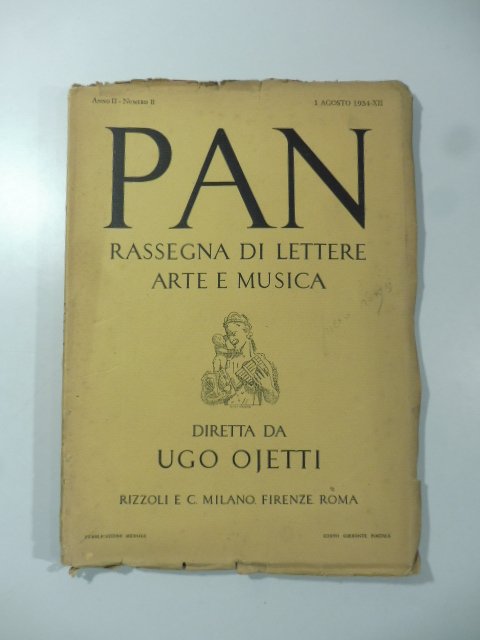 In 8 (cm 19 x 26,5 circa), pagine numerate da 481 a 639 +VII pagine pubblicitarie iniziali, illustrazioni nel testo. Brossura editoriale con taglietti ai margini dei piatti. Primo numero di questa rivista mensile uscita dal 1933 al 1935 diretto e fondato da Ugo Ojetti. La rivista succedeva ad un'altra breve ma fortunata esperienza ojettiana, Pegaso e, proseguendone l'opera, sotto il segno come quella, della humanitas, usciva all'insegna di libero e militante umanesimo. Pan allarga gli orizzonti a interessi piu' ampi rispetto alla precedente Pegaso, spaziando dalla letteratura greca alla latina, dalla storia alle arti figurative secondo un ideale di humanitas antinovecentesco e filofascista. Fra i contributi in questo numero: Massimo Mila, Caratteri della musica di Ponchielli; Giovanni Comisso, Noi in Tunisia; Louis Gillet, Gli artisti francesi in Italia; Marziano Bernardi, Carlo Pittara e la scuola di Rivra; ecc.