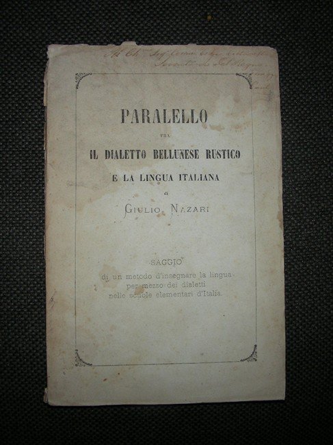 in-16 gr., pp.109, leg.coeva cart. Intonso. Contiene la grammatica dialettale, diverse poesie dialettali e un dizionario con le voci del dialetto che non appartengono alla lingua. Invio autograf.dell'autore.