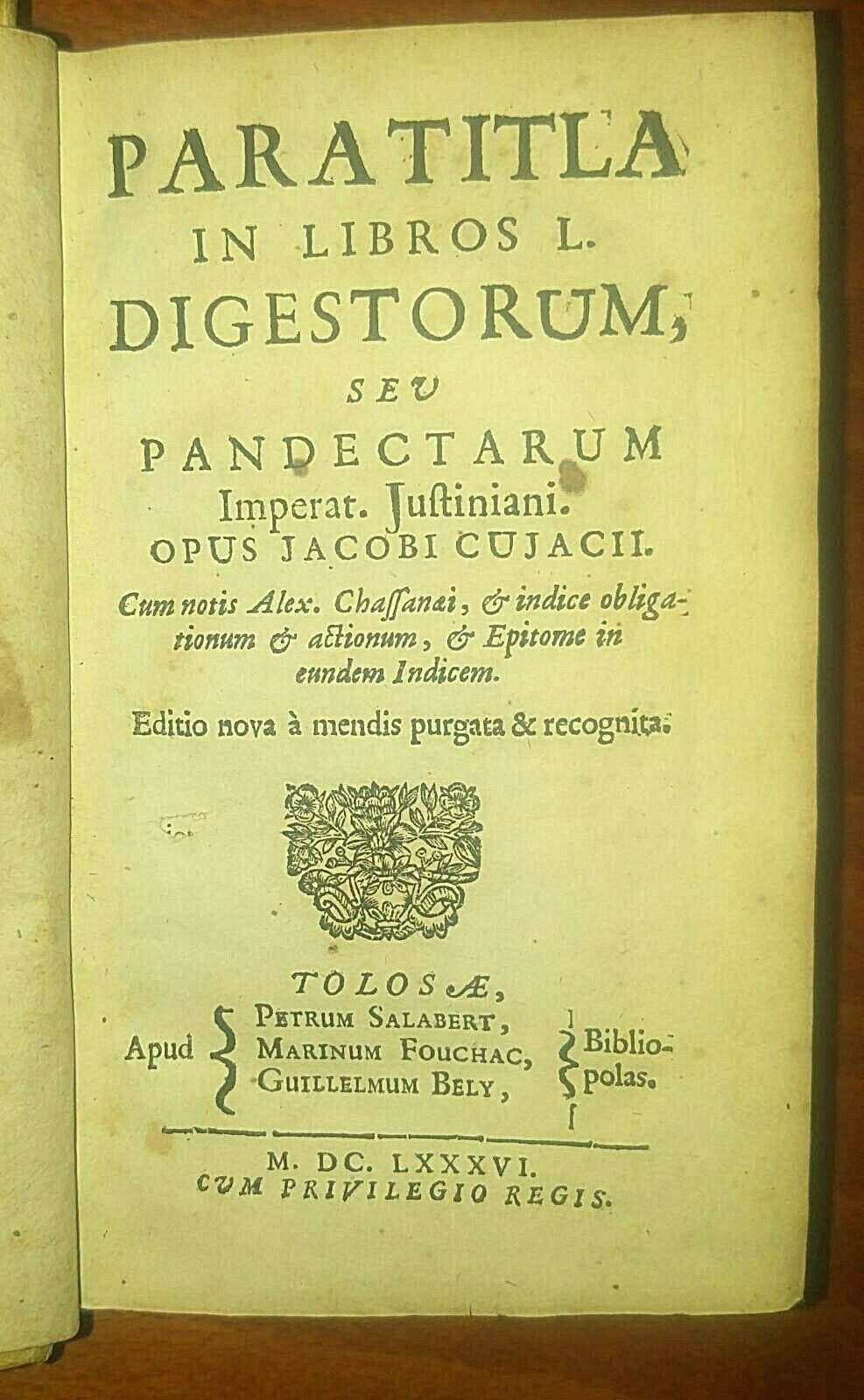 PARATITLA IN LIBROS L DIGESTORUM di Jacobi Cujacii 1686 Tolosa libro antico
