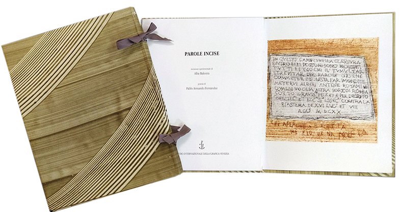 Libro d'artista realizzato nel 2018. L’opera è una incisione sperimentale a stucco su matrice mm 195 x 200 stampata su carta Rosaspina Fabriano. Tiratura 12 esemplari numerati e firmati. Formato libro mm 310 x 235. Il libro, cucito a filza, è raccolto in cartella decorata a mano con la tecnica all’amido.