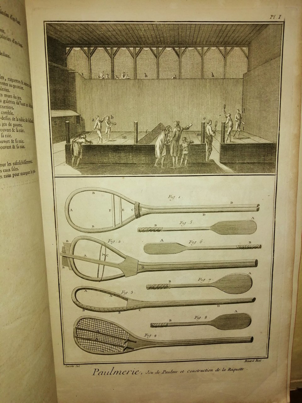 In-folio (39,5 cm) (2) IX c. (di tav.) Cartoncino con carta marmorizzata. Tavole incise da Benard. Antenato diretto del tennis, il gioco della pallacorda, nato in Italia o in Francia nel XIII secolo, si praticava, come nel Padel, in campi delimitati e quindi era lecito il colpo di rimbalzo. Di grande diffusione nel XVIII secolo, viene tuttora praticato anche a livello professionistico. La serie di planche proviene dalla opera forse più importante per la storia del pensiero illuministico "Encyclopédie ou Dictionnaire raisonné des sciences, des arts et des métiers", opera in 35 voll., di cui 11 di tavole, pubblicata a Parigi tra il 1751 e il 1772. Diretta da D. Diderot, intendeva esporre i progressi compiuti dall'umanità in tutti i campi, con particolare riguardo alla tecnica. Le voci furono scritte da letterati, specialisti, medici e ingegneri, tra cui J.-B. D'Alembert, Voltaire, C. Montesquieu, J.-J. Rousseau, E. Condillac. "Recueil de Planches, sur les sciences, lse arts liberaux, et les arts mechaniques, avec leur explication. Septieme livraison, ou huitieme volume. 254 planches. A Paris, chez Briasson, rue Saint Jacques, à la Science, 1771". (EN) In-folio (39.5 cm) (2) IX c. (on plate) Cardboard with marbled paper. Plates engraved by Benard. Direct ancestor of tennis, the game of tennis, born in Italy or France in the 13th century, was practiced, as in Padel, in delimited fields and therefore the rebound shot was legal. Widespread in the 18th century, it is still practiced even at a professional level. The series of planche comes from perhaps the most important work for the history of Enlightenment thought "Encyclopédie ou Dictionnaire raisonné des sciences, des arts et des métiers", a work in 35 volumes, of which 11 are tables, published in Paris between 1751 and 1772. Directed by D. Diderot, it intended to expose the progress made by humanity in all fields, with particular attention to technology. The entries were written by scholars, specialists, doctors and engineers, including J.-B. D'Alembert, Voltaire, C. Montesquieu, J.-J. Rousseau, E. Condillac. "Recueil de Planches, sur les sciences, lse arts liberaux, et les arts mechaniques, avec leur explication. Septieme livraison, ou huitieme volume. 254 planches. In Paris, chez Briasson, rue Saint Jacques, à la Science, 1771".