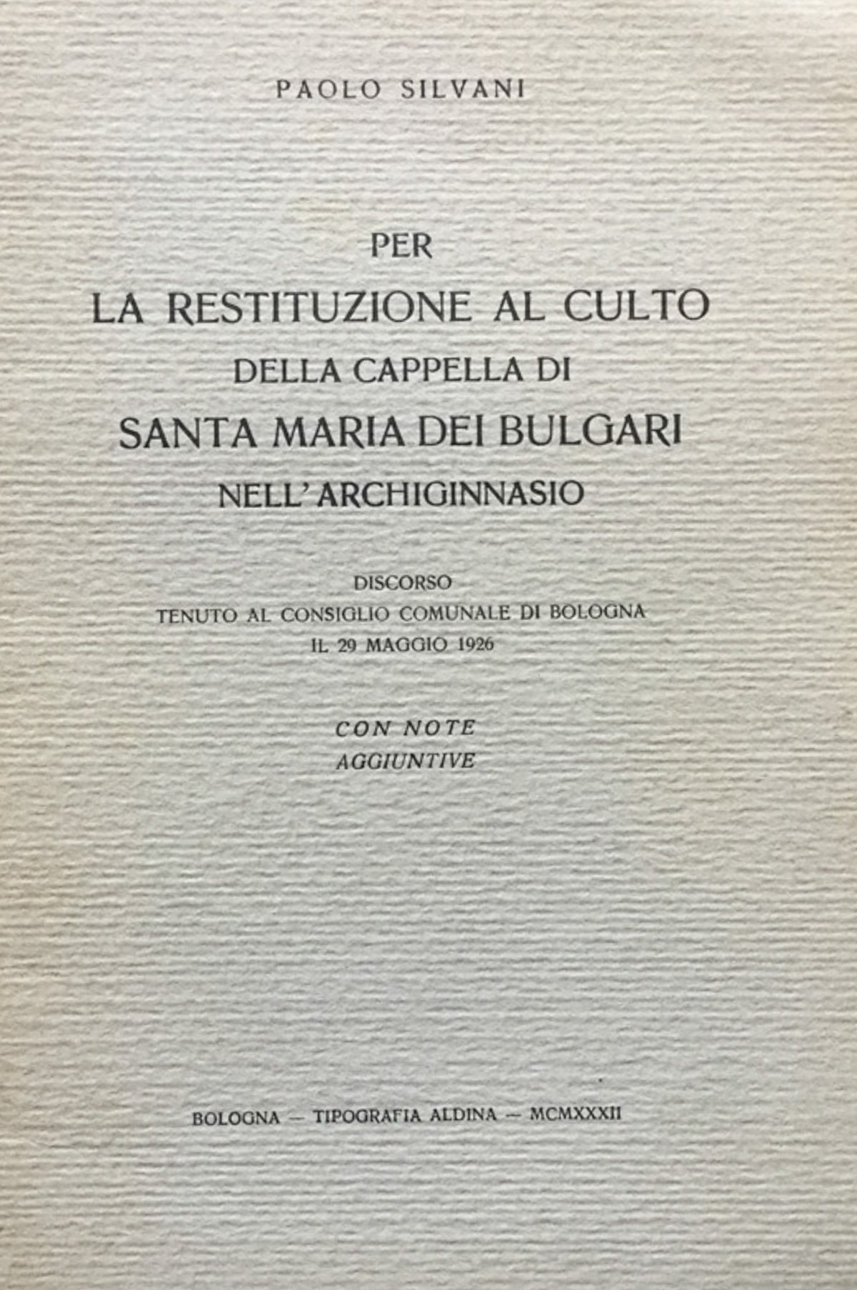 Per la restituzione al culto della Cappella di Santa Maria dei Bulgari nell'Archiginnasio. Discorso tenuto al Consiglio comunale di Bologna il 29 maggio 1926
