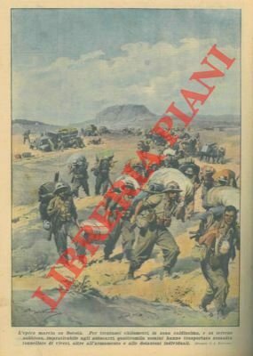 Per trentasei chilometri, in zona caldissima, e su terreno sabbioso, impraticabile agli autocarri, quattromila uomini hanno trasportato sessanta tonnellate di viveri, oltre all'armamento e alle dotazioni individuali.