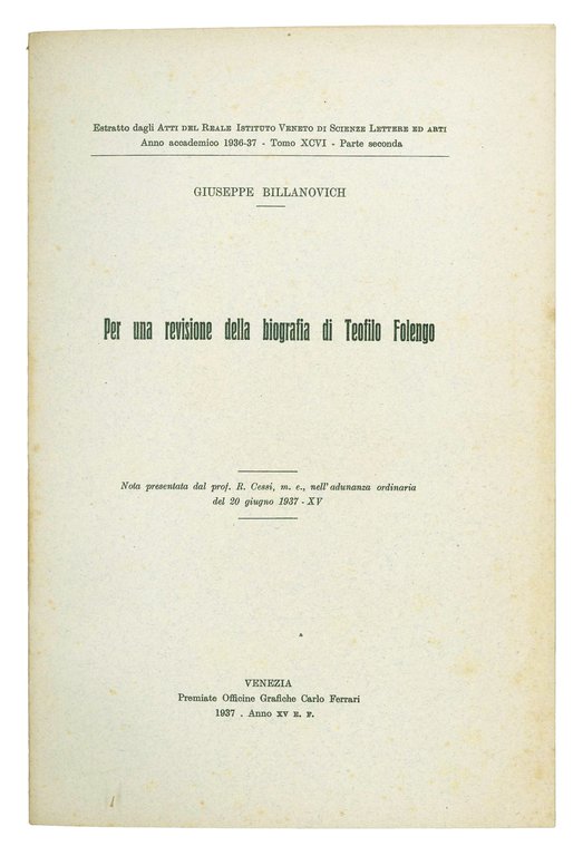 Per una revisione della biografia di Teofilo Folengo. Stralcio dagli Atti del Reale Istituto Veneto di Scienze Lettere ed Arti - Anno Accademico 1936-37 - Tomo XCVI - Parte seconda.