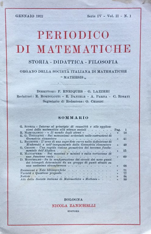 Gennaio 1922 Organo della Società italiana Mathesis. Direttori: F. enriques, G. Lazzeri. Redattori: E. Bortolotti, E. Daniele, A. Perna, C. Rosati. 510 - Ba In Ottavi (15-23cm ) Ottimo (Fine) Ottimo