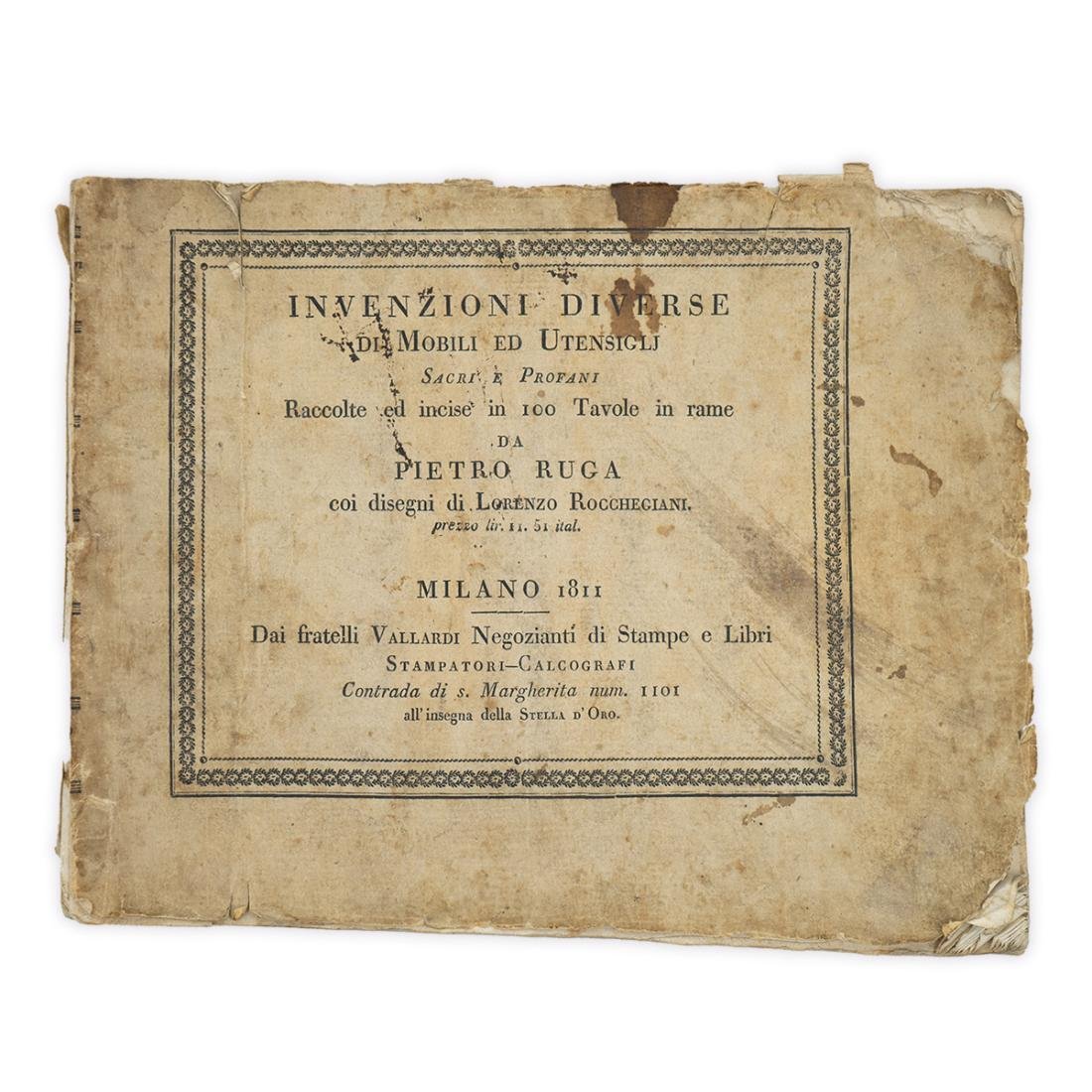 Invenzioni Diverse di Mobili ed UtensigljSacri e Profani Raccolte ed incise in 100 Tavole in rame Da Pietro RugaCoi disegni di Lorenzo Rocchegiani. MILANO 1811Dai fratelli Vallardi Negozianti di Stampe e LibriStampatori - CalcografiContrada di S. Margherita num. 1101All'insegna della Stella d'Oro. Pagine: 100 TavoleCopertina: BrossuraCondizioni: Discrete condizioni generali come da immagini, segni del tempo, copertina e frontespizio slegati