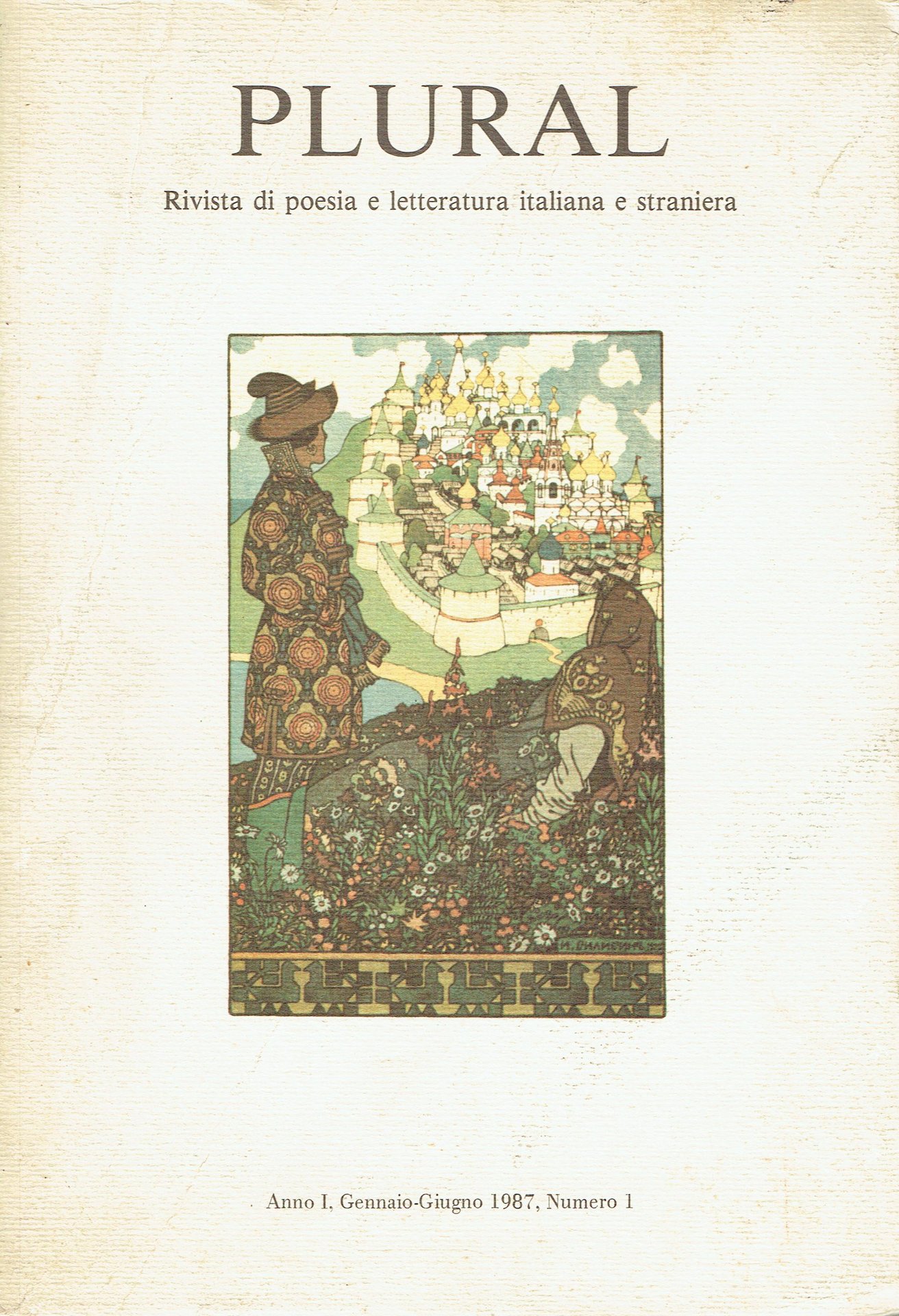 Plural, anno I, gennaio-giugno 1987, numero 1. Rivista semestrale. Tiratura di 800 esemplari numerati, esemplare n. 98. Illustrato, 123 pp. brossura Buono (Good) copertina sciupata e impolverata, con piccoli strappi ai bordi, pieghe su piatto anteriore e prime 22 pp, timbro "in omaggio" su aletta posteriore.