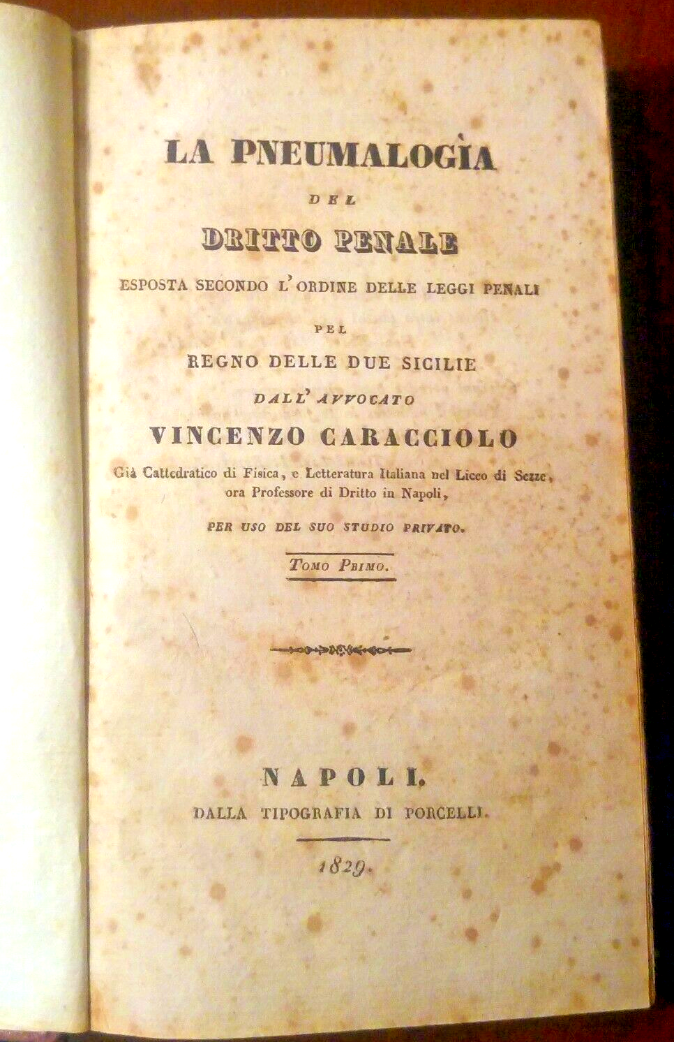 LA PNEUMALOGIA DEL DRITTO PENALE esposta secondo l'ordine delle leggi penali per Regno delle due Sicilie dall'avvocato Vincenzo Caracciolo. Opera completa di 2 tomi rilegati in un volume.
