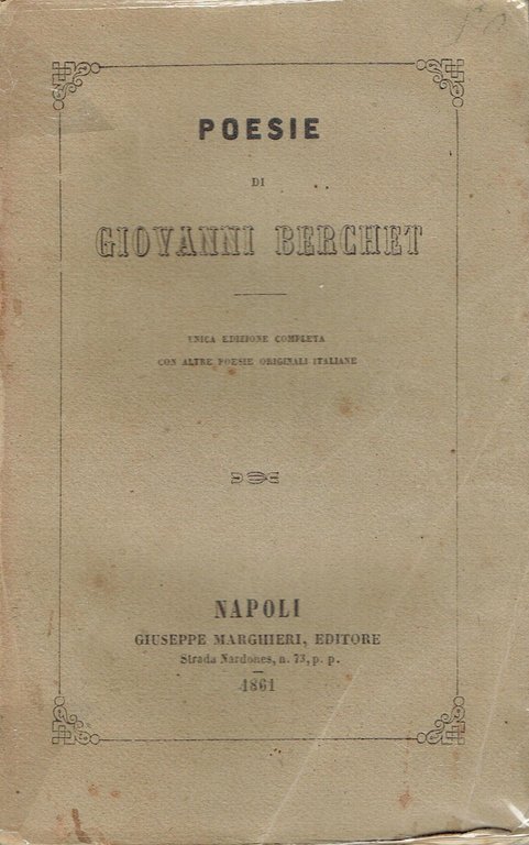 Giuseppe MArghieri editore, 1861. Sottotitolo: Unica edizione completa con altre poesie originali italiane, 167 pp. copertina rigida Buono (Good) segni del tempo con alcune fioriture, copia restaurata su legatura. Nessuna pagina mancante.