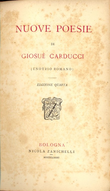 Raccolta di edizioni Zanichelli di opere di Cardcucci. Legatura editoriale mezza pelle, prima metà del Novecento. Contiene: Nuove Poesie (1881), Satana e polemiche sataniche (1882), Il canto dell'amore (1878), Odi Babrbare (terzxa edizione, 1880), Nuovi odi barbare (1882). 851 � Ba In Ottavi (15-23cm ) Ottimo (Fine) Ottimo