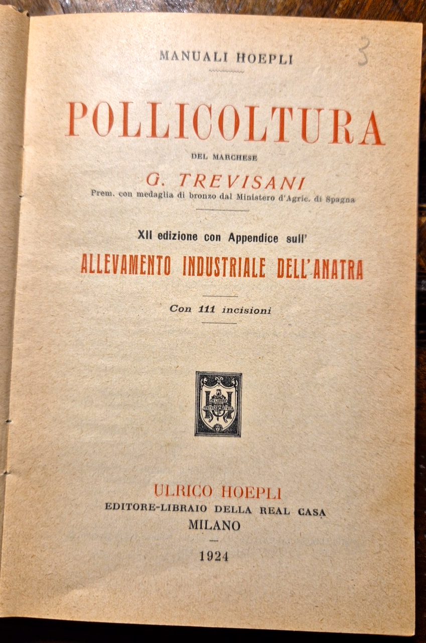 POLLICOLTURA di Trevisani 1924 Ulrico Hoepli libro manuale allevamento anatra