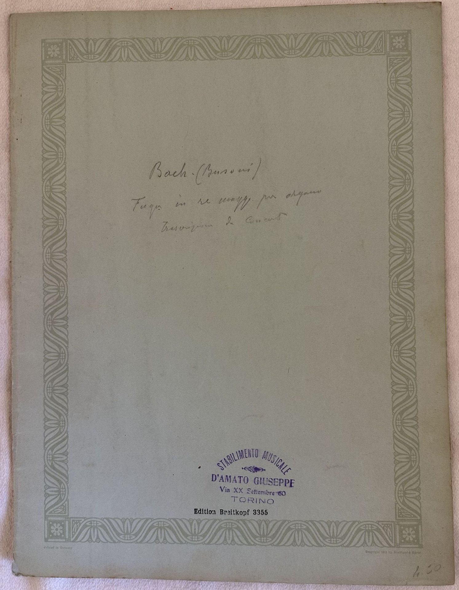 Edizione del 1902 della melodia "Praludium und fuge d dur" di Johann Sebastian Bach (1685-1750)" rivista da Ferruccio Busoni. In ottime condizioni. Copertina editoriale in ottime condizioni con lievi usure marginali. Legatura in buone condizioni. Pagine in ottime condizioni con rare fioriture.In folio. cm. 30,5x23,5. Pp. 16.Edition of 1902 of the melody "Praludium und fuge d dur" by Johann Sebastian Bach (1685-1750)" reviewed by Ferruccio Busoni. In very good conditions Editorial cover in very good conditions lightly worn in the extremities. Binding in good conditions. Pages in very good conditions with occasional foxing. In folio. cm. 30,5x23,5. Pp. 16.