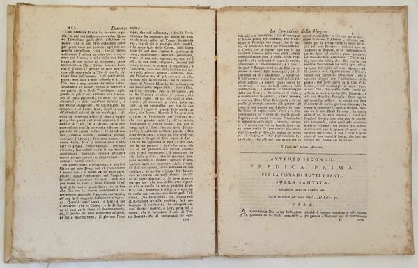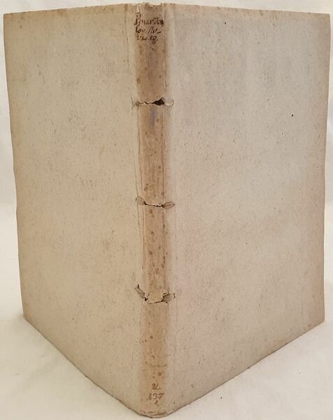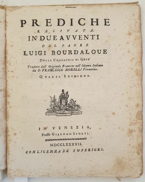 Edizione del 1787 di questa raccolta di prediche del Padre Louis Bourdaloue (1632-1704).<BR> Bourdaloue, gesuita francese, era noto per l'eloquenza profusa nei sermoni che recitava, si dice con gli occhi chiusi con magistrale teatralità. Egli era predicatore alla corte di Luigi XIV. Il suo nome sembra derivi da uno strumento in uso nel 1600, un orinale connesso con la lunga durata delle sue prediche che le devEdizione del 1787 di questa raccolta di prediche del Padre Louis Bourdaloue (1632-1704). Bourdaloue, gesuita francese, era noto per l'eloquenza profusa nei sermoni che recitava, si dice con gli occhi chiusi con magistrale teatralità. Egli era predicatore alla corte di Luigi XIV. Il suo nome sembra derivi da uno strumento in uso nel 1600, un orinale connesso con la lunga durata delle sue prediche che le devote incontinenti usavano sotto le gonne per non perdere neppure un minuto delle sue prediche. Traduzione a cura di Francesco Morelli. L'opera è in un volume ed è completa. Alcune prediche sulla natività di Gesù Cristo. In buone condizioni. Copertina in cartonato coevo con titolo manoscritto al dorso in buone condizioni generali con lievi usure ai margini e dorso. Legatura in discrete condizioni con rotture. All'interno le pagine si presentano in buone condizioni con fioriture. In 4. Dim. 27x21,5 cm. Pp. (4)+204.ote incontinenti usavano sotto le gonne per non perdere neppure un minuto delle sue prediche. L'opera è in un volume ed è completa. Alcune prediche sulla natività di Gesù Cristo. In buone condizioni. Copertina in cartonato coevo con titolo manoscritto al dorso in buone condizioni generali con lievi usure ai margini e dorso. Legatura in discrete condizioni con rotture. All'interno le pagine si presentano in buone condizioni con fioriture. In 4. Dim. 27x21,5 cm. Pp. (4)+204. Edition of 1787 of this collection of preeches by the Father Louis Bourdaloue (1632-1704). Bourdaloue, a french jesuit, was famous for the eloquence of his sermons, people said he speeched with closed eyes and with magistral theatrality. He was a speecher in the Court of Louis XIV. His name seems derivated from a tool used during 1600, a chamber pot connected with the long duration of its speeches that devoted incontinents used under their skirts in order to not lose neither a minute of his speeches. The work is in one volume and it is complete. Some preeches about the nativity of Jesus Christ. Collationed complete work. In good conditions Carton coeval cover with handwritten title in the spine in good general conditions lightly worn in the extremities. Binding in fair conditions with cracks. Inside pages are in good conditions with foxings. In 4. Dim. 27x21,5 cm. Pp. (4)+204.