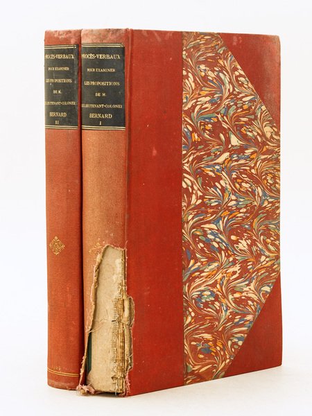 2 vol. in-8 reliure demi-percaline à coins rouge, Imprimerie Commerciale Marcellin Rey, Saïgon, 1909, 548-56 ; 532-59 pp. Rappel du titre complet : Procès-Verbaux de la Commission instituée par arrêté de M. le Lieutenant-Gouverneur de la Cochinchine en date du 6 janvier 1909 pour examiner les propositions de M. l'Administrateur délégué de la Compagnie des Messageries Fluviales relatives au Service Postal et des correspondances fluviales et maritimes de la Cochinchine, du Cambodge et du Laos (2 Tomes - Complet) [ Avec : ] Commission instituée par arrêté de M. le Lieutenant-Gouverneur de la Cochinchine en date du 6 janvier 1909 pour examiner les propositions de M. l'Administrateur délégué de la Compagnie des Messageries Fluviales relatives au Service Postal et des correspondances fluviales et maritimes de la Cochinchine , du Cambodge et du Laos [ Avec : ] Projet de Contrat définitif présenté par la Commission Très rare exemplaire bien complet, proposant une extraordinaire richesse documentaire sur l'état de la circulation fluviale et maritime de la Cochinchine, du Cambodge et du Laos au début du XXe siècle. Le compte-rendu des discussions fournit une grande diversité de points de vue. Etat moyen (dos du tome I très abîmé avec fort manque, qq. mouill. sur reliure et très petites mouill. marginale, bon état intérieur par ailleurs, exemplaire méritant d'être établi dans une reliure de qualité). Prix en l'état