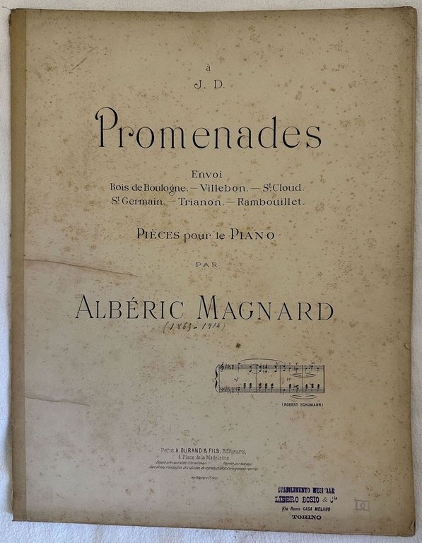 Edizione della fine dell'ottocento di questa raccolta di melodie "Promenades" del compositore francese Alberic Magnard (1865-1914). In buone condizioni. Copertina editoriale in buone condizioni con lievi usure marginali. Dorso coperto da carta. Legatura editorialmente assente. Pagine in buone condizioni con rare fioriture. Segno di inchiostro al margine di piegatura della pagine dalla 25 alal fine senza perdita di testo. In 4. cm.35x27. Pp. 33.Edition of late 19th century of this collection of melodies "Angelus" by the french composer Antoine Francois Marmontel (1816-1898). In good conditions. Editorial cover in good conditions lightly worn in the extremities. Spine covered by paper. Binding is editoriarly missing. Pages in good conditions with occasional foxing. Sign of ink's stain in the folding edge of pages from 25 to the end with no loss of text. In 4. cm.35x27. Pp. 33.<BR><BR>
