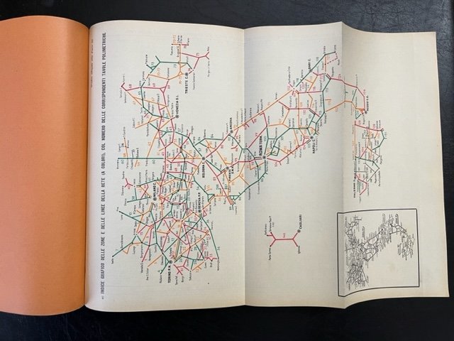 In 8 (cm 17,5 x 24,5), pp. 91 + 117 + 83 + 167 + (1 bianca) con tabelle, quadri sinottici, 1 cartina ripiegata. Danni riparati al dorso e al piatto anteriore. Brossura editoriale. Prontuario diviso in 4 parti, ciascuna con numerazione propria, relative a: linee e stazioni delle Ferrovie dello Stato; quadri e tavole polimetriche delle distanze; quadri delle distanze di allacciamento valevoli per la tassazione dei trasporti delle merci (bagagli esclusi); tavole e quadri delle distanze di allacciamento valevoli per la tassazione dei trasporti dei viaggiatori e bagagli.