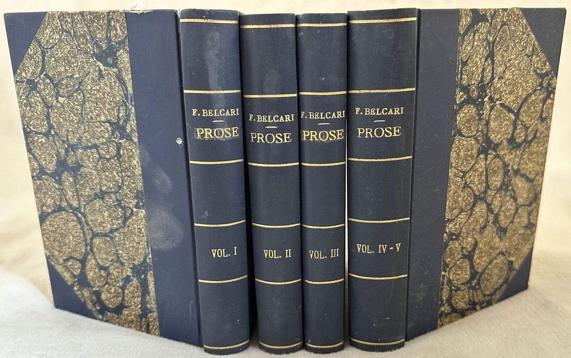 Edizione del 1843 di questa raccolta di opere del poeta e drammaturgo italiano Feo Belcari (1410-1484). Volume appartenente alla collana "Biblioteca classica sacra o sia raccolta di opere religiose di celebri autori". L'opera è composta da cinque tomi legati insieme in quattro tomi ed è completa. All'interno: Vita del Beato Giovanni Colombini; Parte della vita d'alcuni gesuati; Vita di Frate Egidio; Lettere a cura di Domenico Moreni; Due trattati del B. Iacopone da Todi volgarizzate da Feo Belcari; Trattato di Riccardo da S. Vittore de quattro gradi della Carità volgarizzata da Domenico Moreni; il prato spirituale volgarizzamento di Feo Belcari sopra un testo a penna e due stampe antiche riveduto per cura di Ottavio Gigli ecc. Tavola ripiegata in antiporta. Segnalibro in seta celeste. In ottime condizioni. Copertina in mezza tela con titolo e decorazioni in oro al dorso in ottime condizioni generali con lievi usure ai margini e dorso. Legatura in buone condizioni. Pagine in ottime condizioni con rare fioriture. Lieve gora d'umidità al tomo quinto. In 16. Dim. 16,5x11,5 cm. Pp. XCV+203+(3), 294+(1), 262+(1), 219+(3)+175. Peso Kg. 1,100Edition of 1843 of this collection of works by the poet and dramawriter Feo Belcari (1410-1484). Volume belonging to the series "Biblioteca classica sacra o sia raccolta di opere religiose di celebri autori". The work is made up of five tomes bound together in four volumes and is complete. Inside the following works: All'interno: Vita del Beato Giovanni Colombini; Parte della vita d'alcuni gesuati; Vita di Frate Egidio; Lettere a cura di Domenico Moreni; Due trattati del B. Iacopone da Todi volgarizzate da Feo Belcari; Trattato di Riccardo da S. Vittore de quattro gradi della Carità volgarizzata da Domenico Moreni; il prato spirituale volgarizzamento di Feo Belcari sopra un testo a penna e due stampe antiche riveduto per cura di Ottavio Gigli ecc. Bookmark in light blue colour. In very good conditions. Half cloth cover with gilted title and decorations in the spine in very good conditions lightly worn in the extremities. Binding in good conditions. Pages in very good conditions with occasional foxing. Light dump stain in the fifth tome. In 16. Dim. 16,5x11,5 cm. Pp. XCV+203+(3), 294+(1), 262+(1), 219+(3)+175. Weight Kg. 1,100