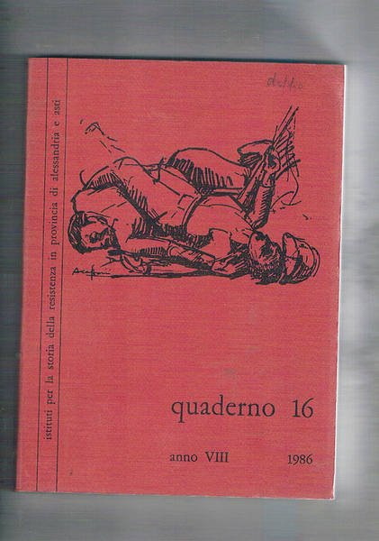 Quaderno n° 16 del 1986 dell'istitito per la storia della resistenza in provincia di Alessandria. L'insurrezione in provincia di Alessandria; in provincia di Asti; poveri ladri e supplicanti, cenni di una storia sociale dell'800 nell'alessandrino; emigranti di Salongi negli Stati Uniti.