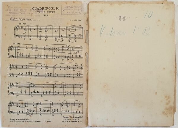 Partitura per orchestra del 1920 della melodia "Quadrifoglio" di Jean Solazzi. Copertina assente. STRUMENTI: pianoforte, violini, violoncello, contrabasso, tromba, trombone, clarinetto, flauto ANNO: 1920 DIMENSIONI: In 8. cm 25,5x17,5 PAGINE: pp. 18 CONDIZIONI: Buone condizioni. Ex libris. La prima pagina in parte staccata.Complete score for orchestra of 1920 of the melody "Quadrifoglio" by Jean Solazzi. Cover lacks. STRUMENTI: piano, violins, violoncello, contrabass, trumpet, trombone, clarinet, flute, YEAR: 1920 SIZE: In 8. cm 25,5x17,5 PAGES: pp. 10 CONDITIONS: Good conditions. Ex libris