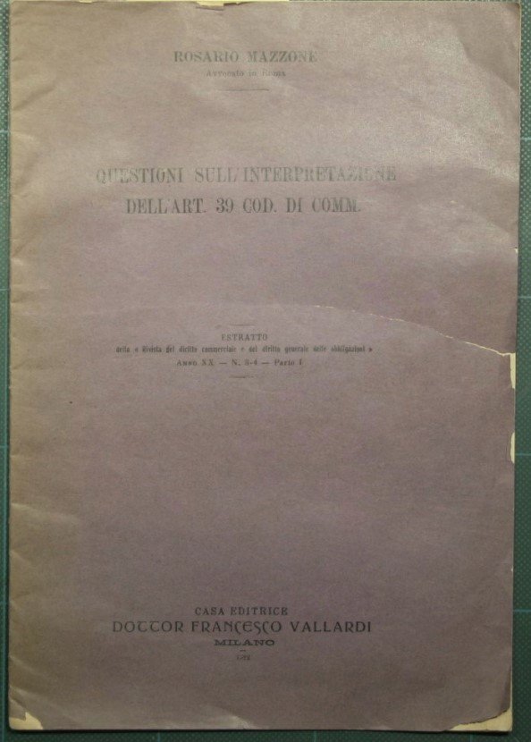 Estratto dalla 'Rivista di diritto commerciale e del diritto generale delle obbligazioni' Anno XX - N. 3-4 - Parte I - in 8° - pp.13 - Brossura editoriale - Strappi con e senza mancanze alla brossura
