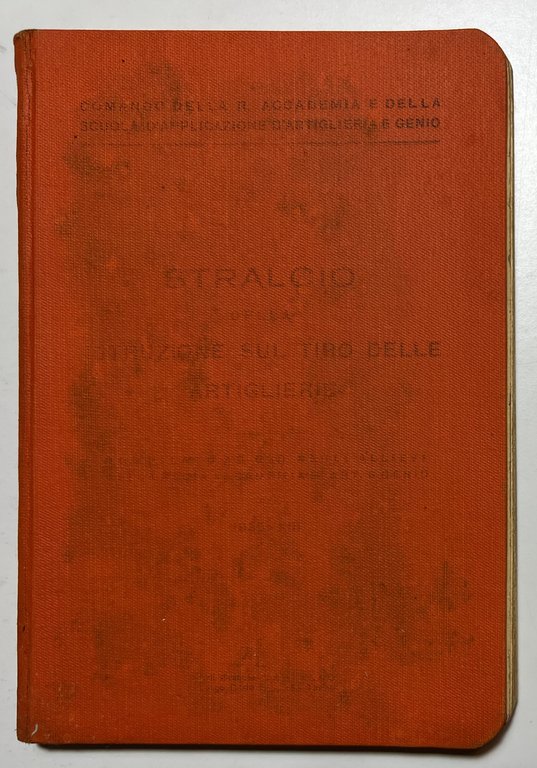 Comando della R. Accademia della Scuola d'Applicazione di Artiglieria e Genio - Stralcio della Istruzione sul Tiro delle artiglierie - Anni '30 Testo in lingua italiana. Pagine 177 con illustrazioni. Copertina rigida. Condizioni molto buone.