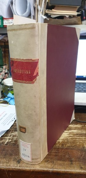 notessur l'influence … dans le chant Ambrosien; La dasilica Ambrosiana primitiva e la ricostuzione; L'ambrosino d'oro; il flagello di S. Ambrogio; Il più antico ritratto di S. Ambrogi. MIlano, Cogliati 1897 Fasc. 14 uniti in-4° di pp. XXIII-12-76-20-37-44-12-58-44-59-57-83-31-63-74, con 7 tav. musicali e 5 tav.di cui 4 a doppia pag. e 1 a col. f.t. Legatura in mezza pergamena con tass.