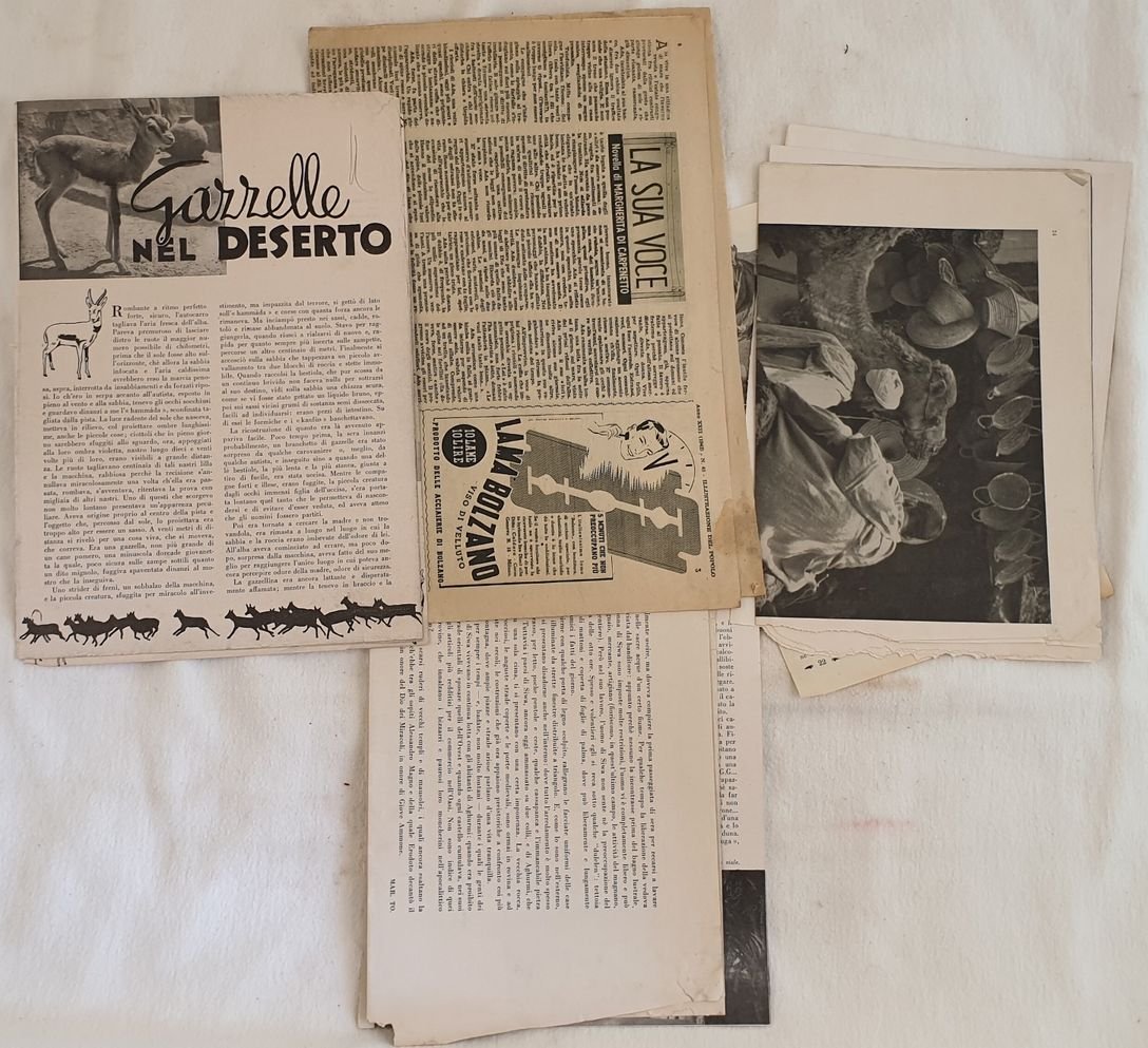 Raccolta di 7 ritagli di giornale sull'Arabia. Gli articoli sono stati tratti da giornali d'epoca e comprendono articoli non sempre completi e planches Gli articoli: Gazzelle nel deserto (Lettura s.d. ma primi del novecento), Tunisia nuovo corso d'operazioni (La domenica del corriere 1942), Colori e costumi dell'oasi di Siwa nell'Egitto orientale, Spahis (La lettura febbraio 1943), Presentazione del dromedario, Algeria, Alcune planches sull'Etiopia. In buone condizioni.Collection of 7 clippings about North Africa.<BR> The articles and plates has been taken from original magazines, not all are complete.<BR> Inside: Gazelles in the desert (Lettura s.d. ma primi del novecento), Tunisia new operations (La domenica del corriere 1942), Colours and costumes of the oasis of Siwa in Oriental Egypt, Spahis (La lettura febbraio 1943), Introduction of camel, Algeria, Some plates about Ethiopia In good conditions.