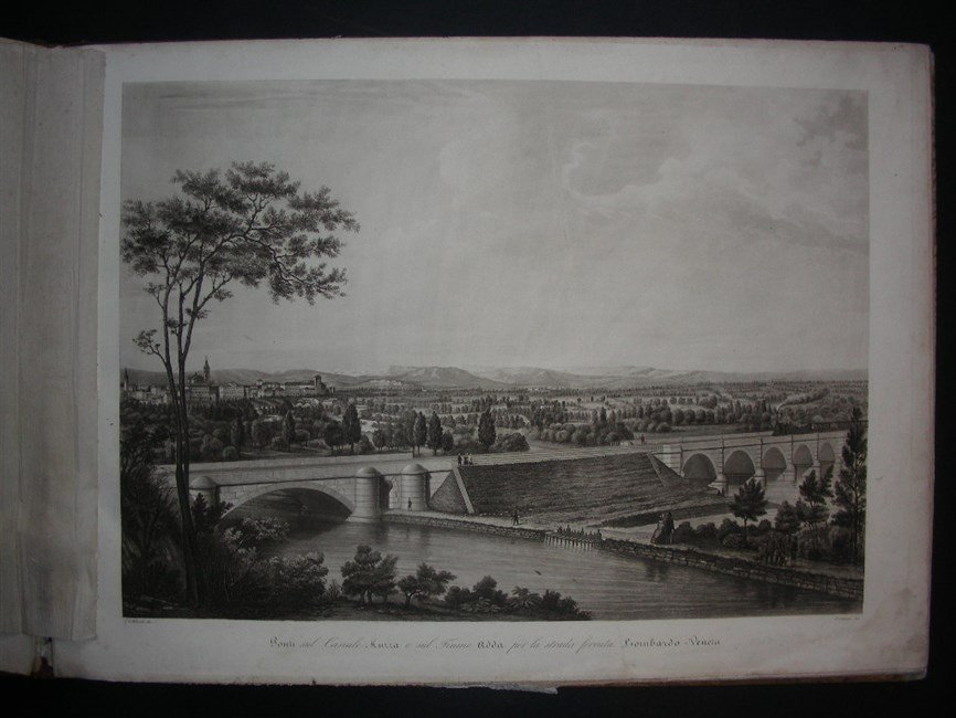 album in folio (mm.435x580), leg. cart. edit. Album composto da 34 tavv. raffiguranti i lavori di ingegneria legati all'asse ferroviario in esame, tra cui una bella veduta di Cassano sull'Adda e una carta topogr. della ferrovia fra Milano e Treviglio. Le tavv. all'acquatinta sono inc. da F. Citterio su dis. del Robecchi. Raro album venduto per sottoscrizione dall'ingegnere Robecchi che, partecipando ai lavori, ebbe il merito di raccoglierne dei disegni e poi farli incidere. Pensiamo che solo nel 1852 sia stato poi aggiunto e pubblicato il testo esplicativo, non abbiamo notizia di un testo di accompagnamento a questa tiratura del 1846. Bibliografia Italiana, Nuova Serie, anno I, 1845, 1919: "[.] tavola 1 una tavola prospettica dei due grandi ponti sul canale Muzza e sul fiume Adda con adiacenze servirà da frontespizio [.]". Giornale dell'I. R. Istituto Lombardo di Scienze Lettere ed Arti, tomo XV, 1846, p. 132 e segg.: "L'intiera opera sarà compiuta entro il futuro 1847 e si avrà riguardo di dare eguali intervalli di tempo fra la pubblicazione delle diverse parti". Bibliografia Ferroviaria Italiana online cita la nostra edizione del 1846 con il solo album e quella del 1852 completa del testo. Dif. al d. Bell'esempl. [276]