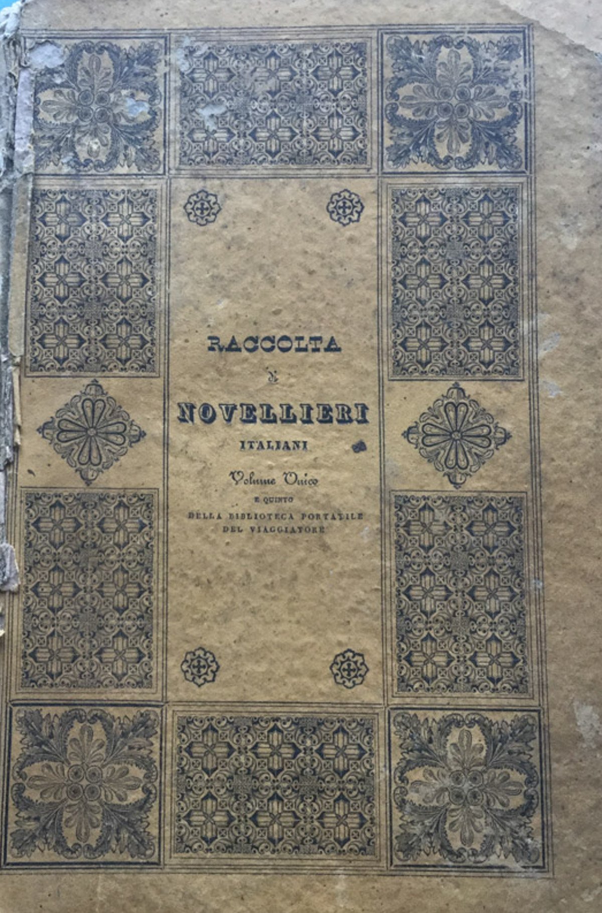 Biblioteca Popolare del Viaggiatore. Volume V. Contiene testi letterari italiani, stampati tra il 1832 e il 1833 con unica numerazione delle pagine. Contiene novelle di Gentile Sermini, Alessandro M. Bandiera, M. Bernardo Ilicini, Scipione Bargagli, M. Giustiniano Nelli, Alessandro Sozzini, Pietro Fortini. Con incisione complessiva dell'erma degli autori citati. Cond.: fioriture su molte pagine. Manca il dorso. Gore sui piatti. 853 - Ba In Ottavi (15-23cm ) Mediocre (Poor) Accettabile