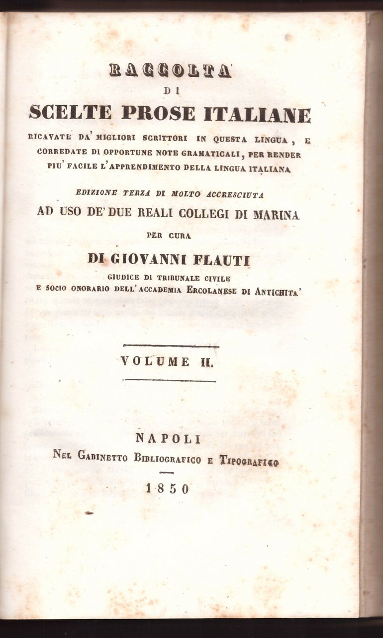 RACCOLTA DI SCELTE PROSE ITALIANE ricavate da migliori scrittori in questa lingua e corredate di opportune note grammaticali per rendere più facile l'apprendimento della lingua italiana. Terza edizione di molto accresciuta ad uso de due reali collegi di marina per cura di GIOVANNI FLAUTI.