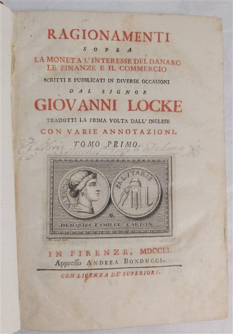 RAGIONAMENTI SOPRA LA MONETA l’interesse del Danaro le Finanze e il Commercio, scritti e pubblicati in diverse occasioni da. Tradotti la prima volta dall’Inglese con varie annotazioni. Tomo primo (e secondo).