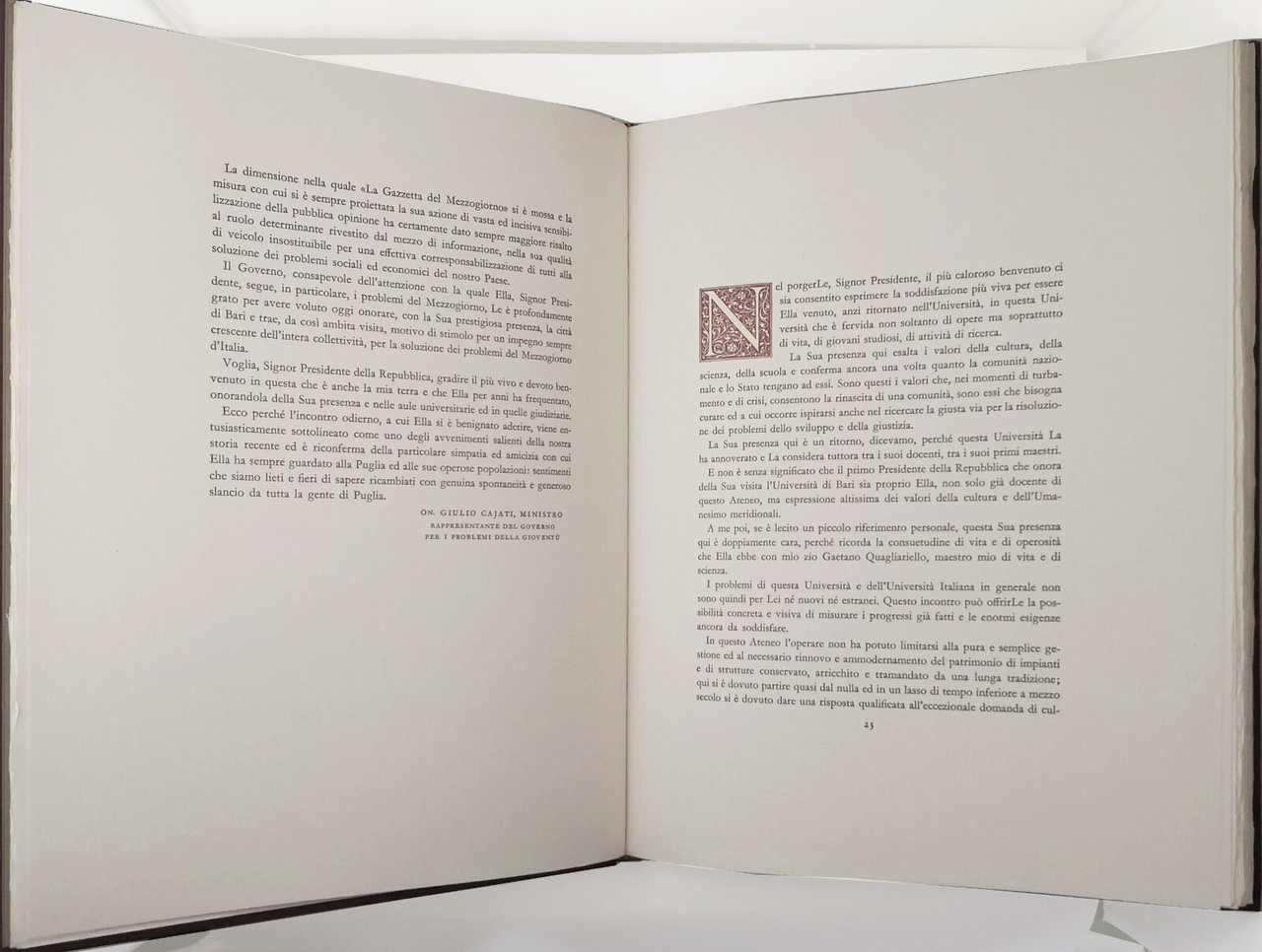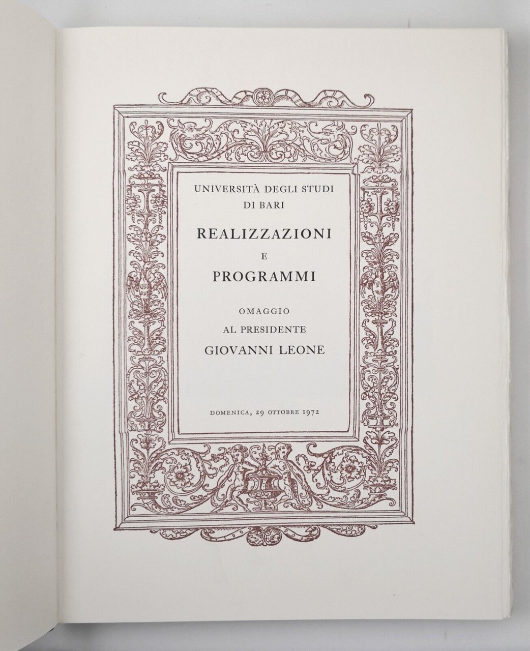REALIZZAZIONI E PROGRAMMI. Omaggio al Presidente Giovanni Leone. Esemplare espressamente stampato per Vito Lattanzio. L'opera eseguita da Vito Macinagrossa per Università degli Studi di Bari.