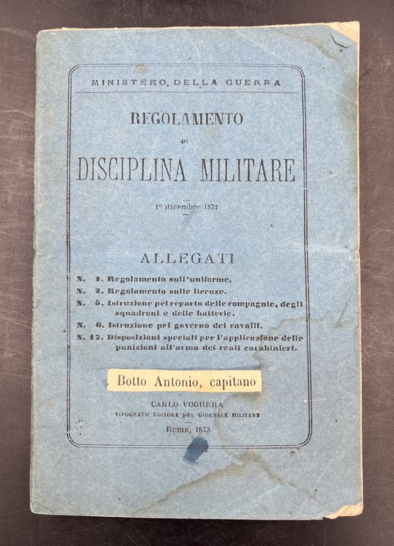 Regolamento di DISCIPLINA MILITARE Allegati 1, 2, 5, 6, 17:. Regolamento delle LICENZE + Istruzione pel riparto delle COMPAGNIE, degli SQUADRONI e delle BATTERIE + ISTRUZIONE pel GOVERNO dei CAVALLI + Disposizioni speciali per l'APPLICAZIONE delle PUNIZIONI all'Arma dei CARABINIERI.