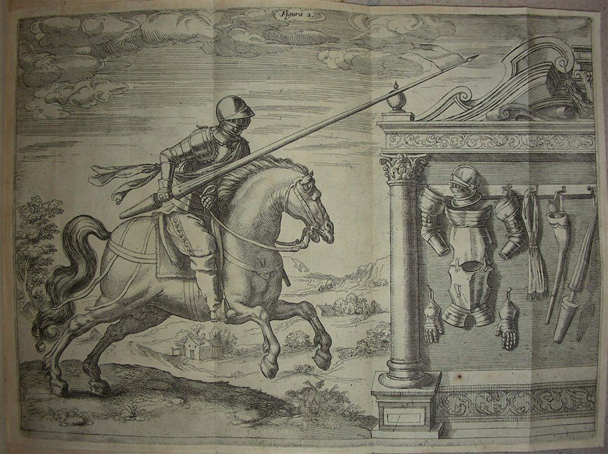 in folio, pp. (12) (compreso titolo e front. inciso), 221, (3), leg. perg. molle coeva con tit. mss al d. Con 16 tavv. inc. in rame ripiegate (le tavv. numerate 14 e 15 sono sullo stesso foglio). Splendido front. interamente inc. in rame raffigurante figure allegoriche e cavalieri con bellissime armature. Con numerose iniziali finemente incise in rame e in legno figurate, testatine in rame con scene di battaglie e allegorie. Le tavole, ripiegate anche più volte, raffigurano scene di duello con cavalli, dispiegamento di truppe, campi di battaglia, etc. Antica firma di appartenenza al margine inf. del front. e sigillo nella pagina di titolo. Prima rara ediz. originale. Piantanida II, 1441. Alcune pagine brunite e tarlo che interessa il margine superiore bianco (senza perdita di testo) per circa 20 carte, ma buona copia. [246]