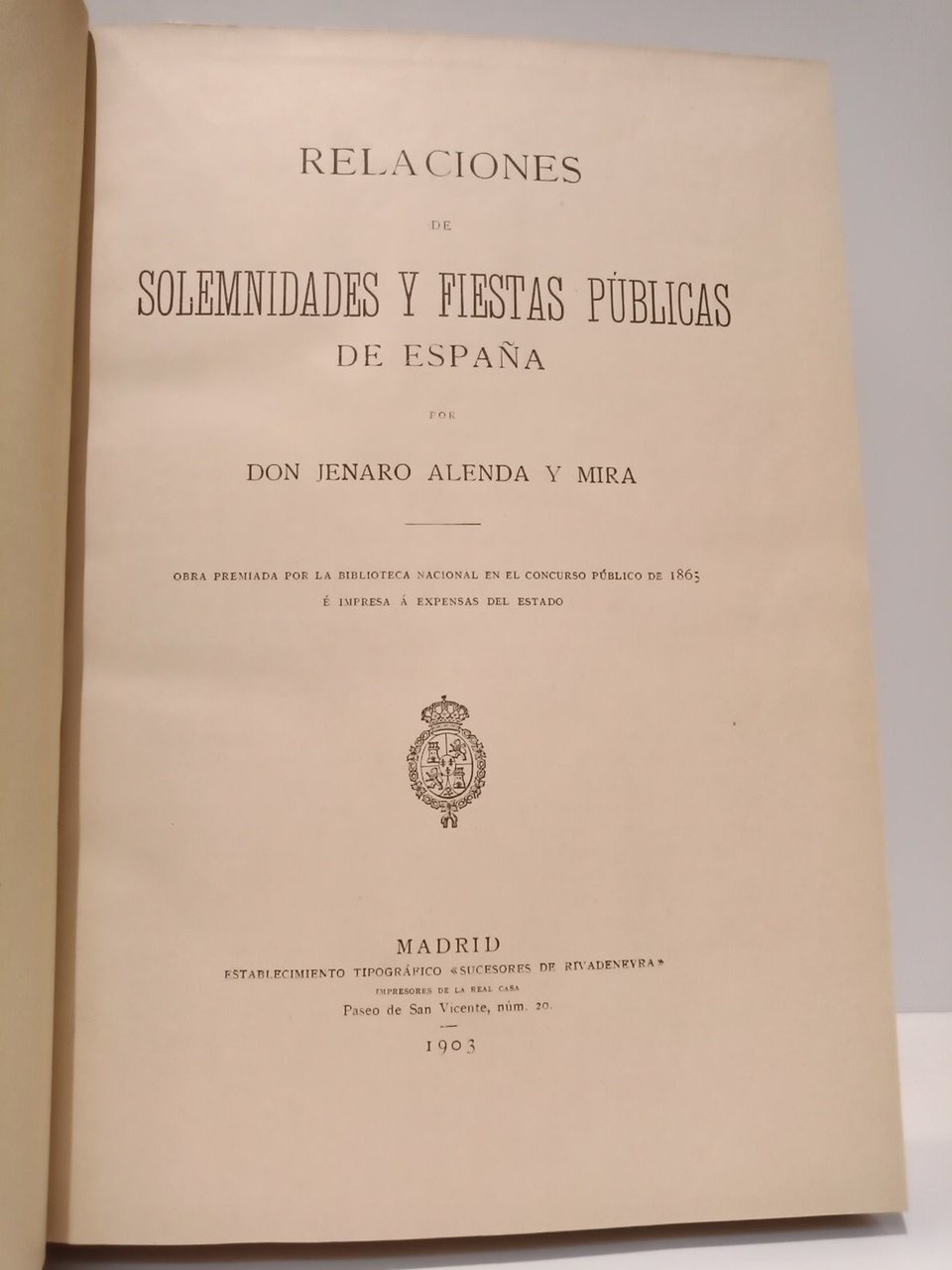 Relaciones de solemnidades y fiestas públicas de España. (Obra premiada por la Biblioteca Nacional en el Concurso Público de 1865 é impresa á expensas del Estado). [COMPLETO en 2 vols.] | Livres anciens et modernes | Alenda Y Mira, Jenaro