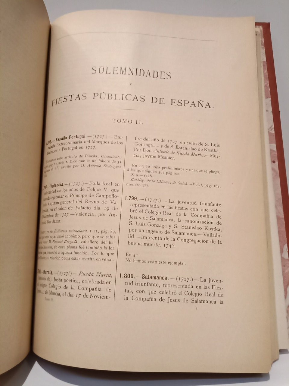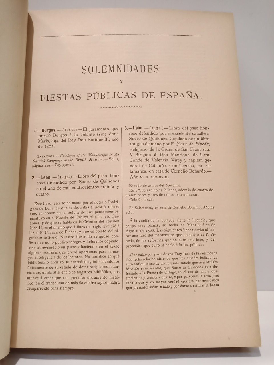 Madrid: Sucesores de Rivadeneyra, 1903.- 2 Vols. en un mismo tomo (LXXXV,527; 224 pp.); 4º mayor (27,2 x 20 cm); Enc. en Media Piel nueva de fina ejecución, lomo dorado, cinco nervios, conservando las cubiertas originales del primer tomo.- Se trata de una extensa bibliografía donde se incluyen libros, folletos y manuscritos que celebran festejos o sucesos importantes hasta 1828. Díaz Arquer 52. Palau 6882, 6883. El Vol. 2 es rarísimo y termina abruptamente, pareciendo incompleto. Sin embargo Palau lo reseña, indicando que efectivamente sólo se imprimieron las primeras 224 páginas. Díaz Arquer ni lo menciona, describiendo el Vol. 1 como único publicado.* Algunas pocas hojas remarginadas y restauradas de pequeños desgarros, pero en general magnífico estado de conservación. FOLKLORE, CANCIONEROS, REFRANEROS, ROMANCEROS Y LEYENDAS DE ESPAÑA