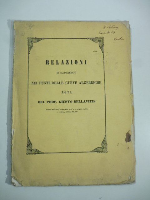 In 4 (cm 24,5 x 35 circa), pp. 19 + (1b). Alcune annotazioni manoscritte ai margini bianchi del testo. Dedica autografa al piatto anteriore. Brossura editoriale con strappetto al piatto anteriore e danni riparati al dorso. Estratto editoriale dagli Atti del R. Istituto Veneto di Scienze, Lettere ed Arti.