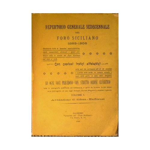 Abbandono di difesa - Enfiteusi - in 8° - pp.869 - Brossura editoriale - Fogli chiusi - Piccola mancanza al piatto superiore, qualche fioritura - Contenente tutte le massime amministrative, civili, commerciali, elettorali, e penali pubblicate nelle 16 annate del foro siciliano dal 1893 al 1908, con copiosi indici alfabetici nelle voci che contengono più di venti massime e qualche volta anche un numero minore, i nomi delle parti, le date delle decisioni. Ad ogni voce precedono con stretto ordine alfabetico tutte le monografie pubblicate nel sedicennio in guisa da formare la più importante bibliografia ad uso degli avvocati, giuristi, magistrati e studiosi in genere.