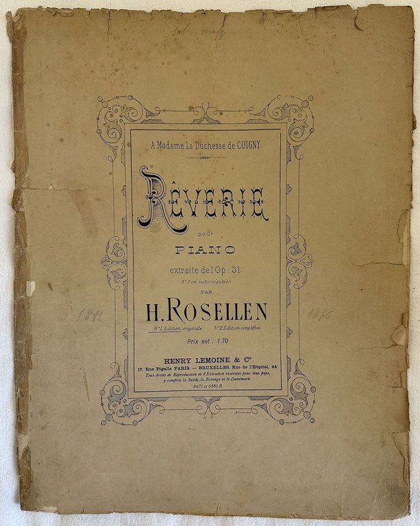 Edizione della fine dell'ottocento di questa melodia per pianoforte "Reverie pour piano" del compositore francese Henri Rosellen (1811-1876). Lo spartito è in uno spartito ed è completo. In mediocri condizioni. Copertina editoriale in mediocri condizioni con usure e strappi marginali. Legatura editorialmente assente. Pagine in buone condizioni con fioriture. Strappi marginali. In folio. cm. 35x27,5. Pp. 5.Edition of late 19th century of the melodiy "Reverie pour piano" by the french composer Henri Rosellen (1811-1876). The score is made up of two parts and it is complete. In poor conditions. Editorial cover in poor conditions with wearings and tears in the extremities. Binding is editoriarly missing. Pages in good conditions with foxing. Wearings and tears. In folio. cm. 35x27,5. Pp. 5.