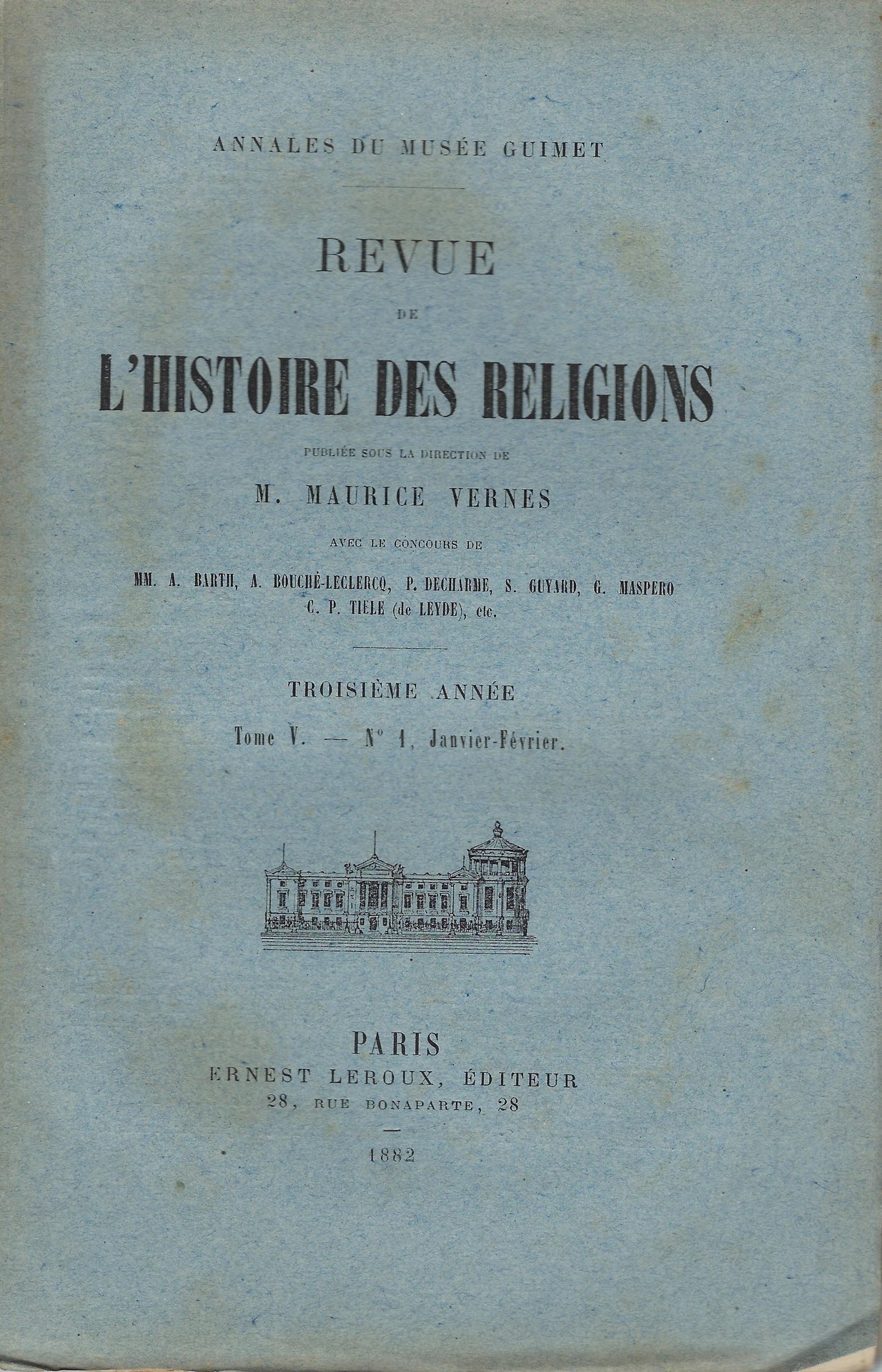 E. Leroux, 1882. Publiée sous la direction de M. Maurice Vernes avec le concours de MM. A. Barth, A. Bouché-Leclercq, P. Decharme, S. Guyard, G. Maspero et al. Troisième année, tome V, n.1 (Janvier-Février), 144 pp. copertina rigida Buono (Good) naturale ingiallimento dal tempo e lievi fioriture su alcune pagine, volume intonso, leggibilità perfetta.
