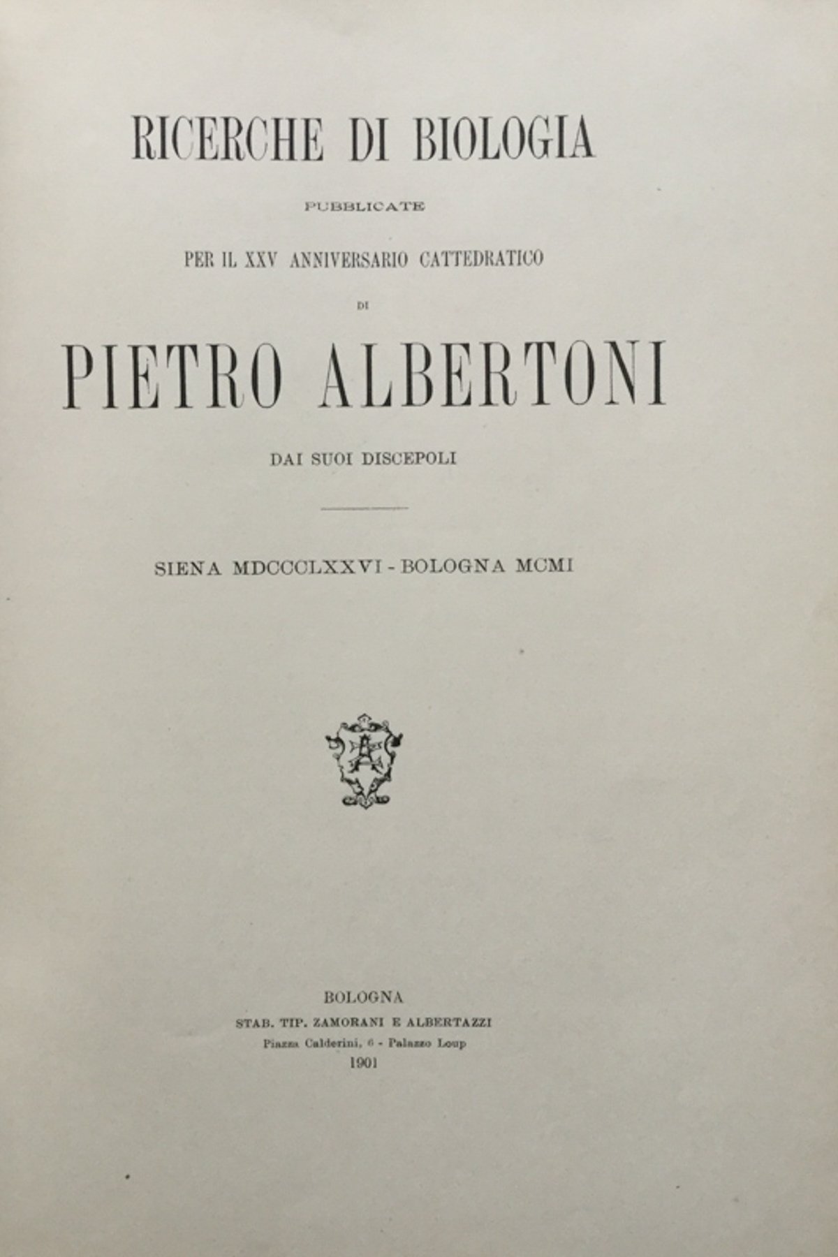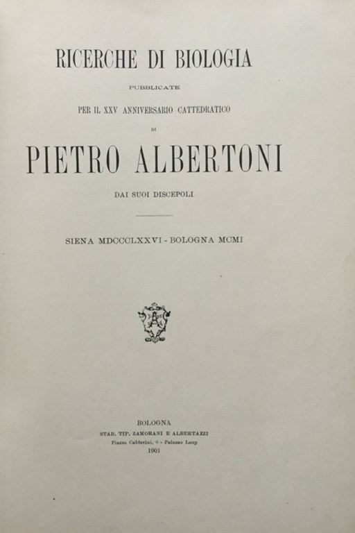 Ricerche di biologia pubblicate per il XXV anniversario cattedrattico di Pietro Albertoni dai suoi discepoli. Siena 1876 - Bologna 1901