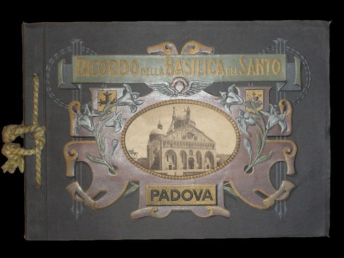 in-16 obl., pp. 16, bross. edit. con belliss. cop. fig. a col. in rilievo con cordoncino di cucitura. Raccolta di 32 vedute della basilica, suoi interni, e monumenti e opere d'arte. [208]