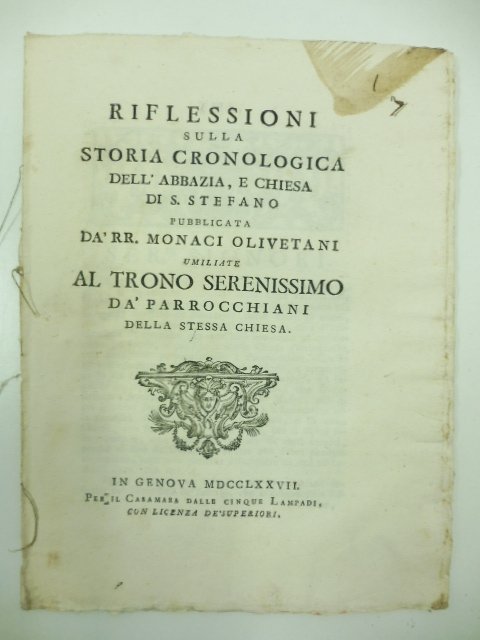 In 8, pp. XX. Lieve alone al front. Br. rifatta con carta d'epoca. Documento che testimonia la rinuncia dei monaci Olivetani della cura parrocchiale della chiesa di Santo Stefano a Genova con annessa storia della fondazione della chiesa. I monaci - si legge - rinunciano alla cura della parrocchiale ma trattengono 'per loro medesimi gl'emolumenti, i fondi, e persino la stessa chiesa parrocchiale con sbandirne perpetuamente i Parrocchiani.'.