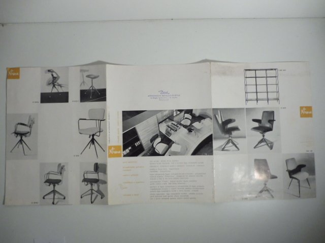 Pieghevole a 4 falde, cm 65 x 24, Timbro del rivenditore. Catalogo dei prodotti di questa importante azienda sorta nel 1917 e produttrice di arredi metallici. Alla fine degli anni '40, con l'entrata in azienda di Gastone Rinaldi, la progettazione vide un balzo in avanti grazie alla ricerca dello stesso Gastone e alla collaborazione di personaggi come Ponti, Albini, Rosselli, Zanuso ecc. Videro cosi' la luce le poltrone DU 10 e DU 11 (con la collaborazione di Ponti), la sedia con schienale basculante DU 9. Nel 1954 la sedia DU 30 vinse il Compasso d'oro e nel 1957 la DU 41 venne anch'essa premiata. Questo catalogo presenta 26 diversi mobili per ufficio. Tra questi diverse sedie come la DU 30 e la DU 10 e la scrivania USC 607.