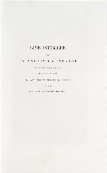 RIME ISTORICHE di un anonimo genovese vissuto nei secoli XII e XIV tratte da un codice dell'Avv. Matteo Molfino di Genova, per cura del Prof.