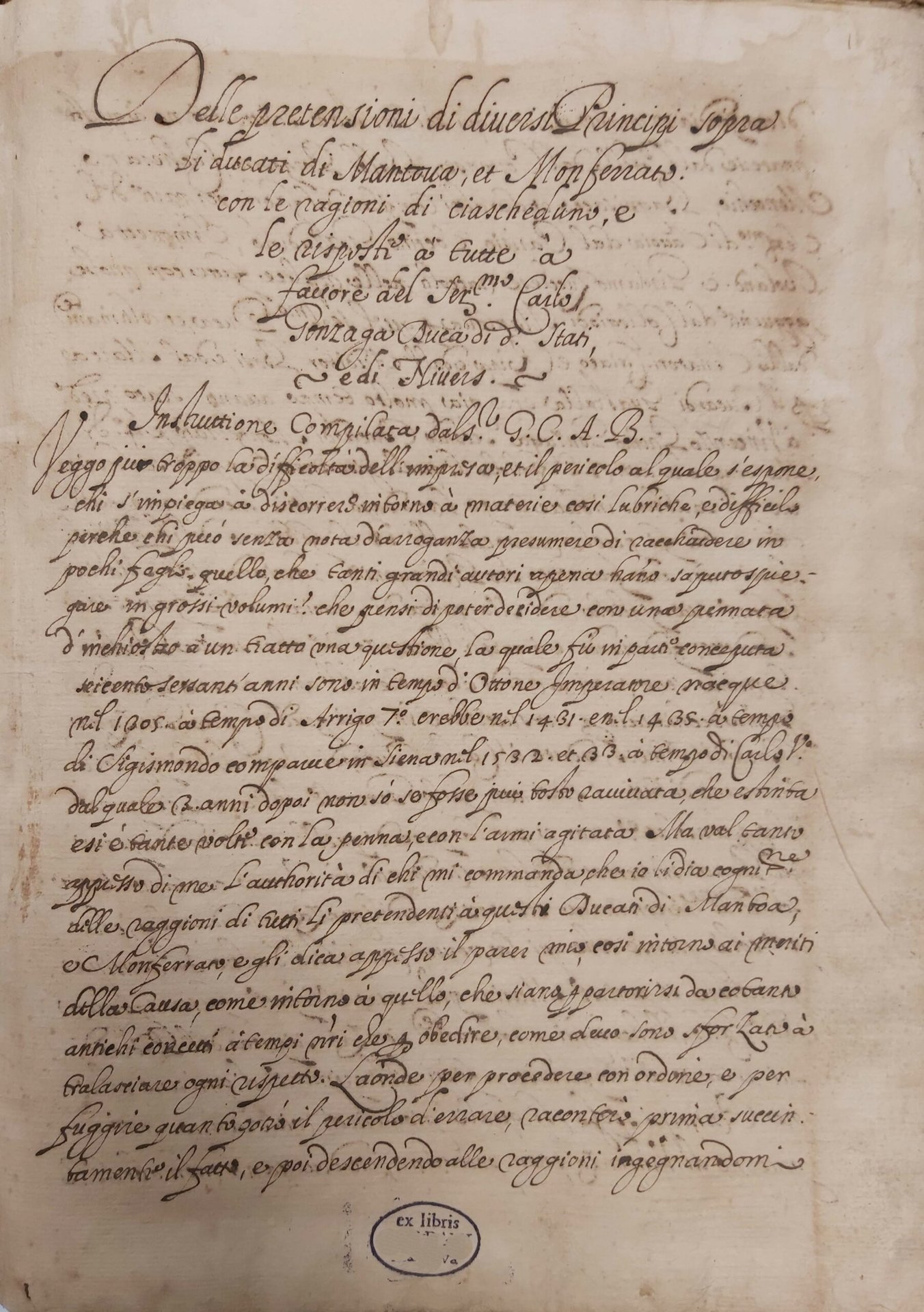 ms in-4, di pp. 60 non numerate, leg. cartone alla rust. L'A. che compare con la sigla G. C. A. B. sostiene la causa dei Gonzaga nella guerra di successione (1628-1631), avvenuta dopo la morte senza eredi di Vincenzo II. Bella grafia secentesca. Ex libris. [383]