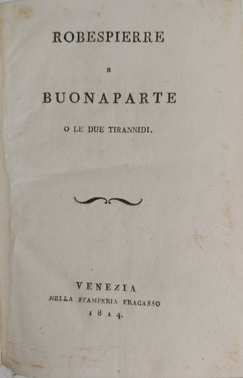 ROBESPIERRE E BONAPARTE o le due tirannidi. Venezia, Fracasso, 1814. Unito: CHATEAUBRIAND F. A. DI BONAPARTE DEI BORBONI e della necessità di attaccarci ai nostri principi legittimi per la felicità della Francia e dell’Europa. Tradotta dal Francese.