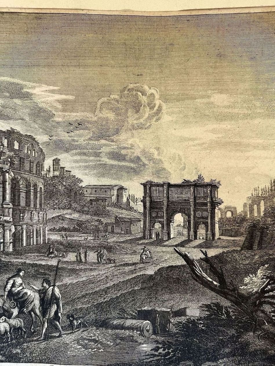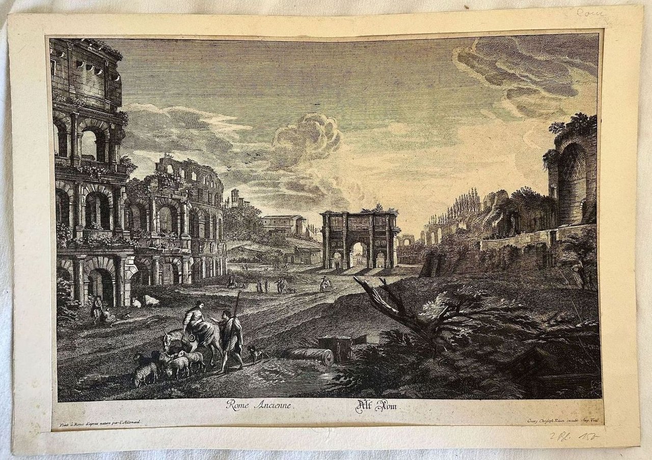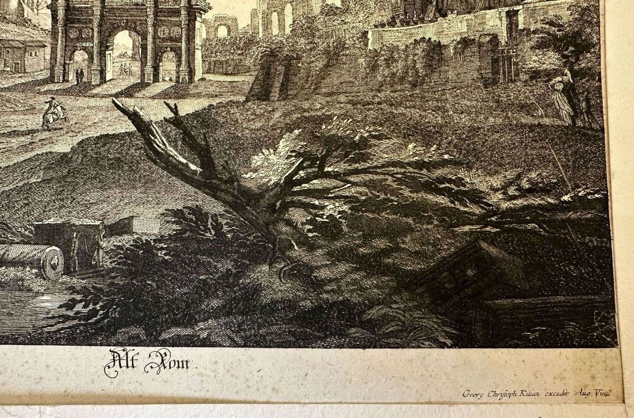 Finissima veduta animata di Roma Antica. L'incisione è stata montata su cartoncino Autore: Georg Christoph Kitian Data: XVIII secolo Tecnica: Acquaforte Dimensione del passepartout: 50,5x35,5 cm Dimensione incisione: 44,5x31,5 cm Condizioni: Buone. Alcune fioriture.Very fine animated view of Ancient Rome. The engraving has been mounted on carton base Author: Georg Christoph Kitian Date: 18th century Technique: Etching Leaf Dimension:50,5x35,5 cm Engraving Dimension: 44,5x31,5 cm Conditions: Good conditions. Some foxing.